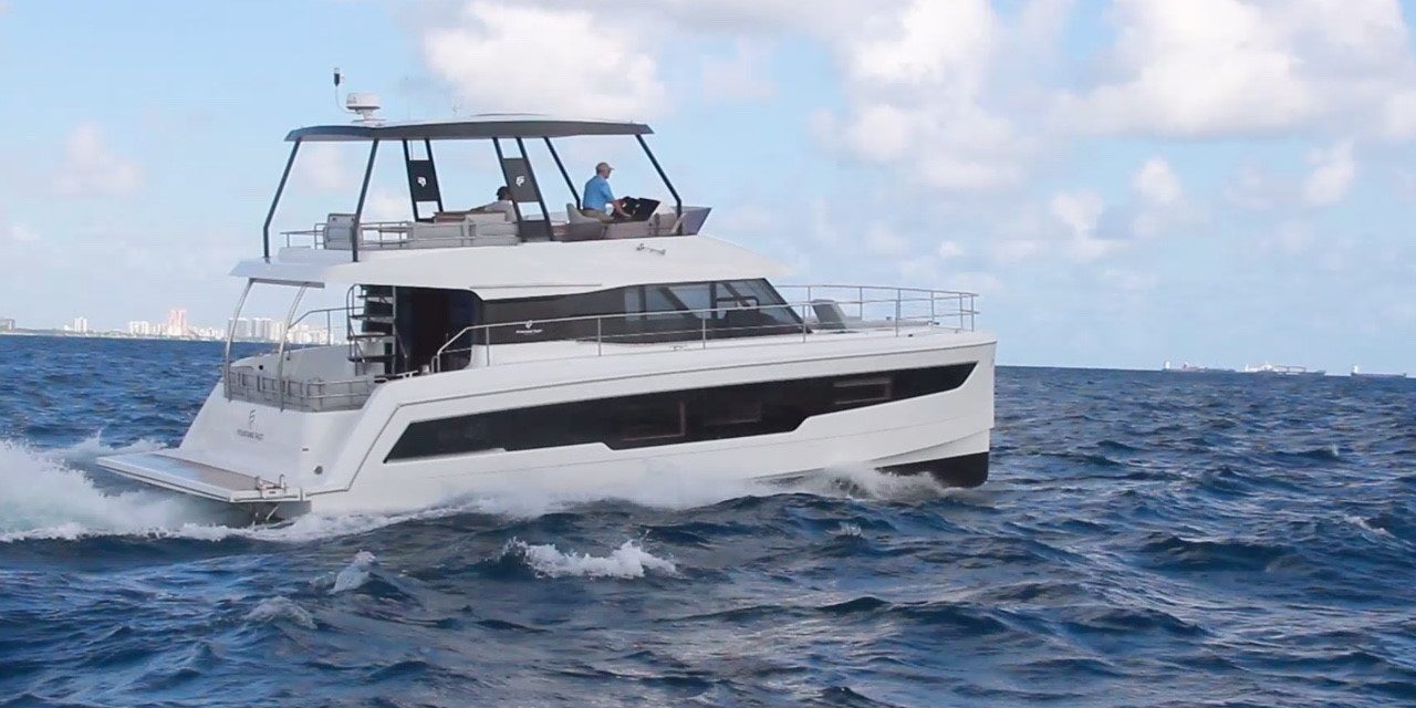 The Fountaine Pajot MY 40 is a luxury cruising power catamaran from French builder Fountaine Pajot. Because MY 40 is a catamaran, there is a lot of space onboard. Fountaine Pajot made excellent use of the space. There is much more volume than would be possible in a comparable monohull. Her accommodations include three staterooms and two heads, plus storage to hold a months’ worth of storage throughout the yacht. Built specifically for IPS pod propulsion, the Fountaine Pajot MY 40 performed well and presents a surprisingly comfortable, dry ride.
