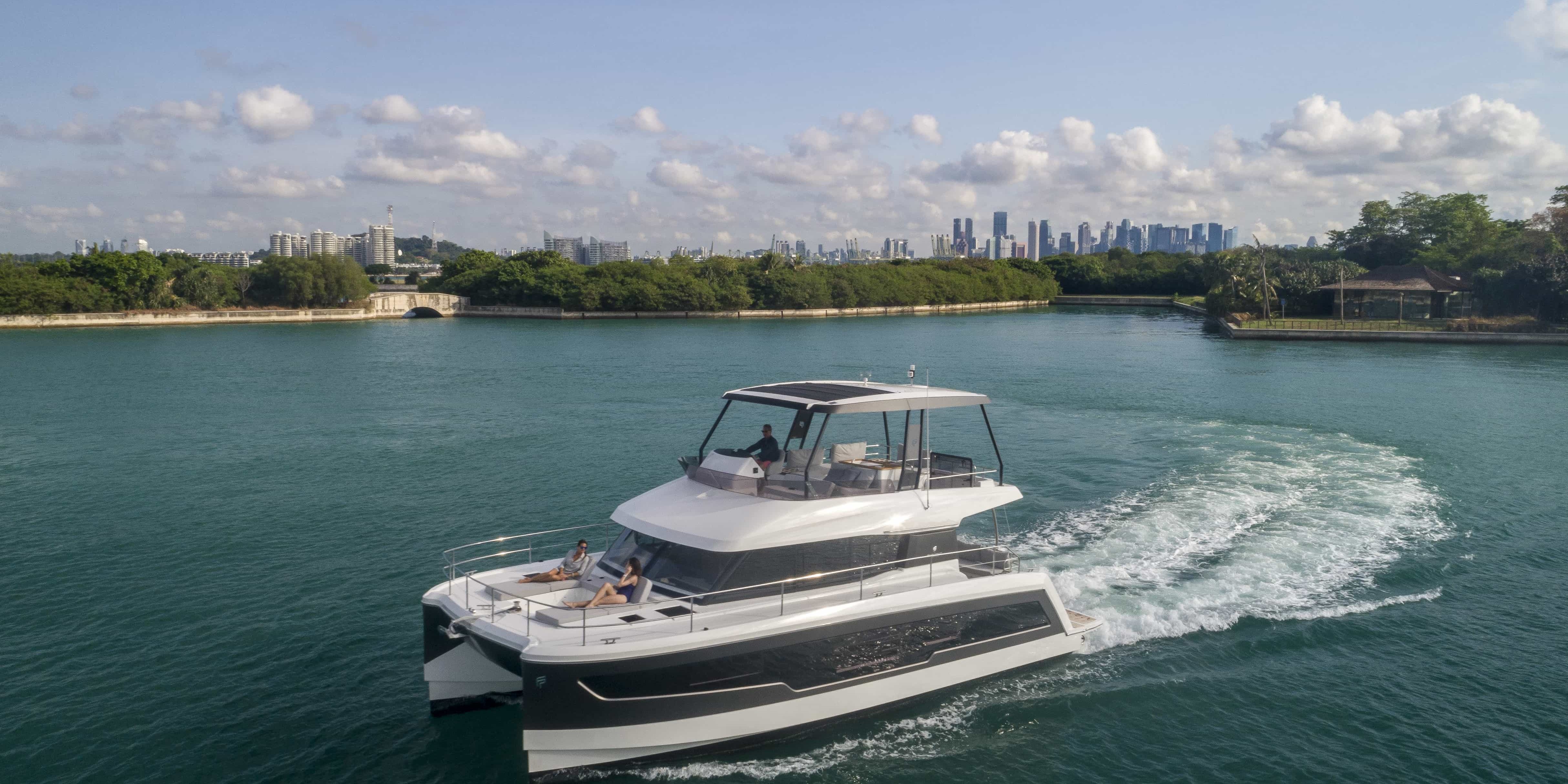 Zavirite u novi Fountaine Pajot Motorni katamaran MY 40 snimljen u originalnom zaljevu na obali Singapura. Singapur je idealna lokacija za testiranje plovila, ujedno urban i divlji, ovaj prekrasni krajolik čini moderne linije novog MY 40 još više nedodirljivim i pokazuju snagu i inovativni karakter ovog motornjaka od 40 stopa.